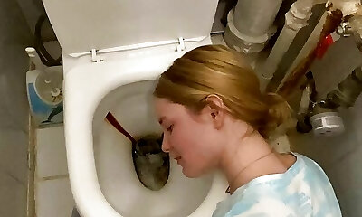 Human toilet damsel gets her face soaked with pee over the toilet