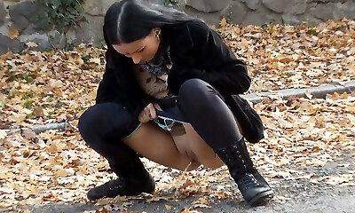 Kinky long haired brunette woman pulls down denim and pisses outdoors